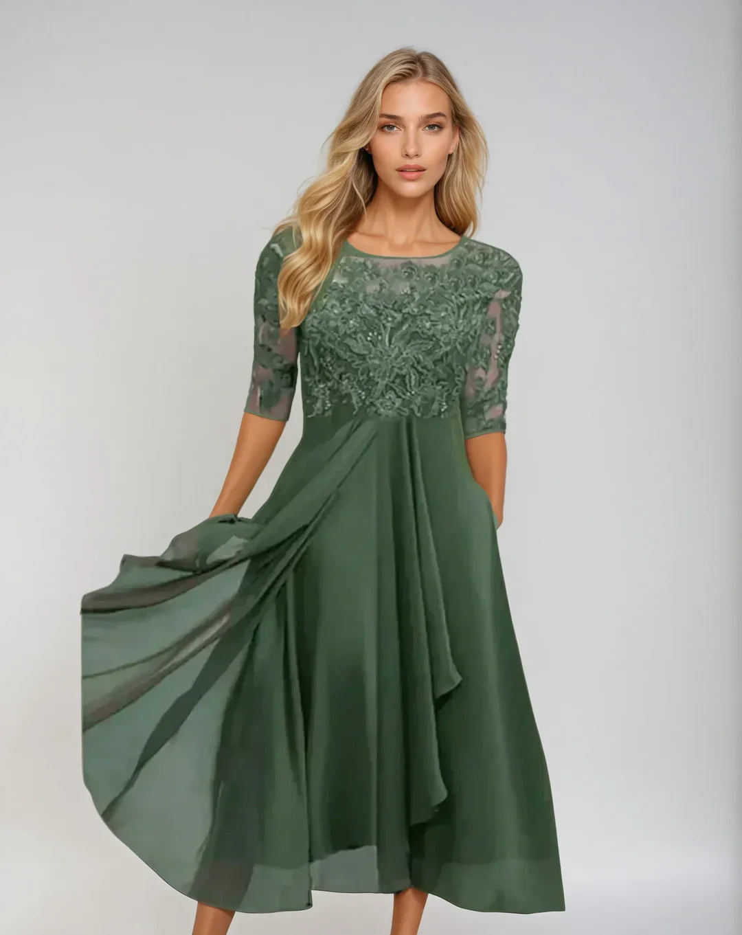 Scopri l'abito Aurora™, un vestito raffinato e fluido pensato per le occasioni speciali. Il corpetto con ricami delicati e le maniche in pizzo donano un tocco di classe, mentre la gonna a strati in chiffon crea un effetto leggero e romantico.